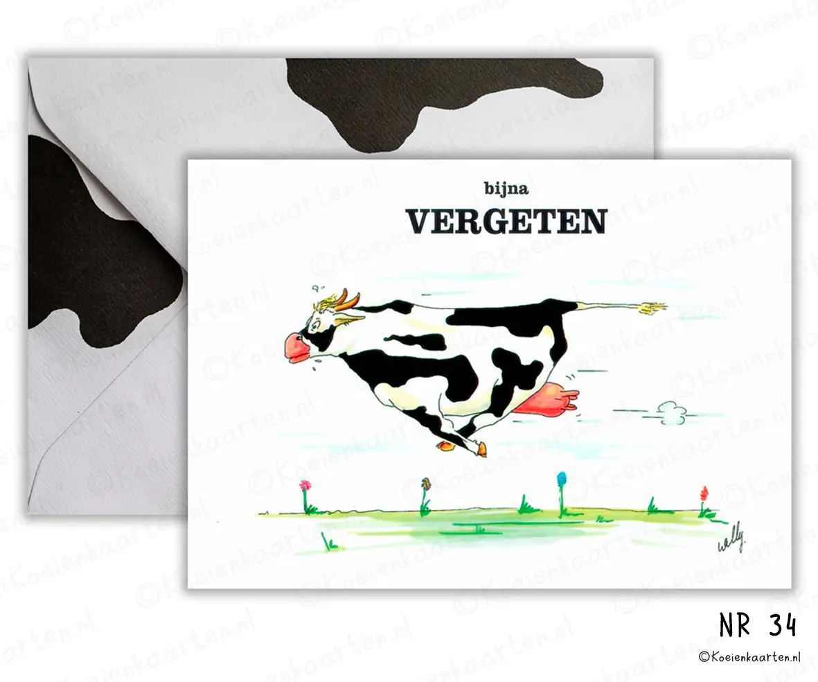 Leuke koeienkaart, bijna vergeten Nr 34 met grappige cartoon! Een koe die zo snel is dat hij over het weiland vliegt.