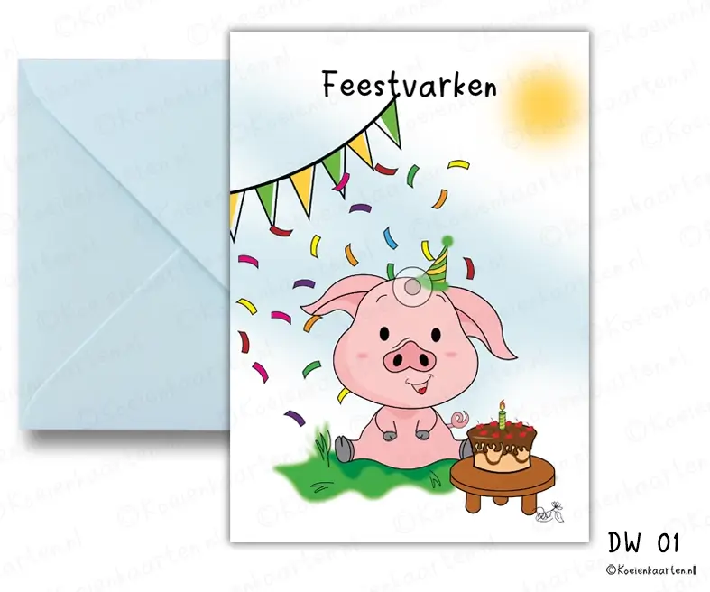 Leuke wenskaart, feestvarken DW 01 met schattige tekening van een feest varkentje, slingersen confetti.