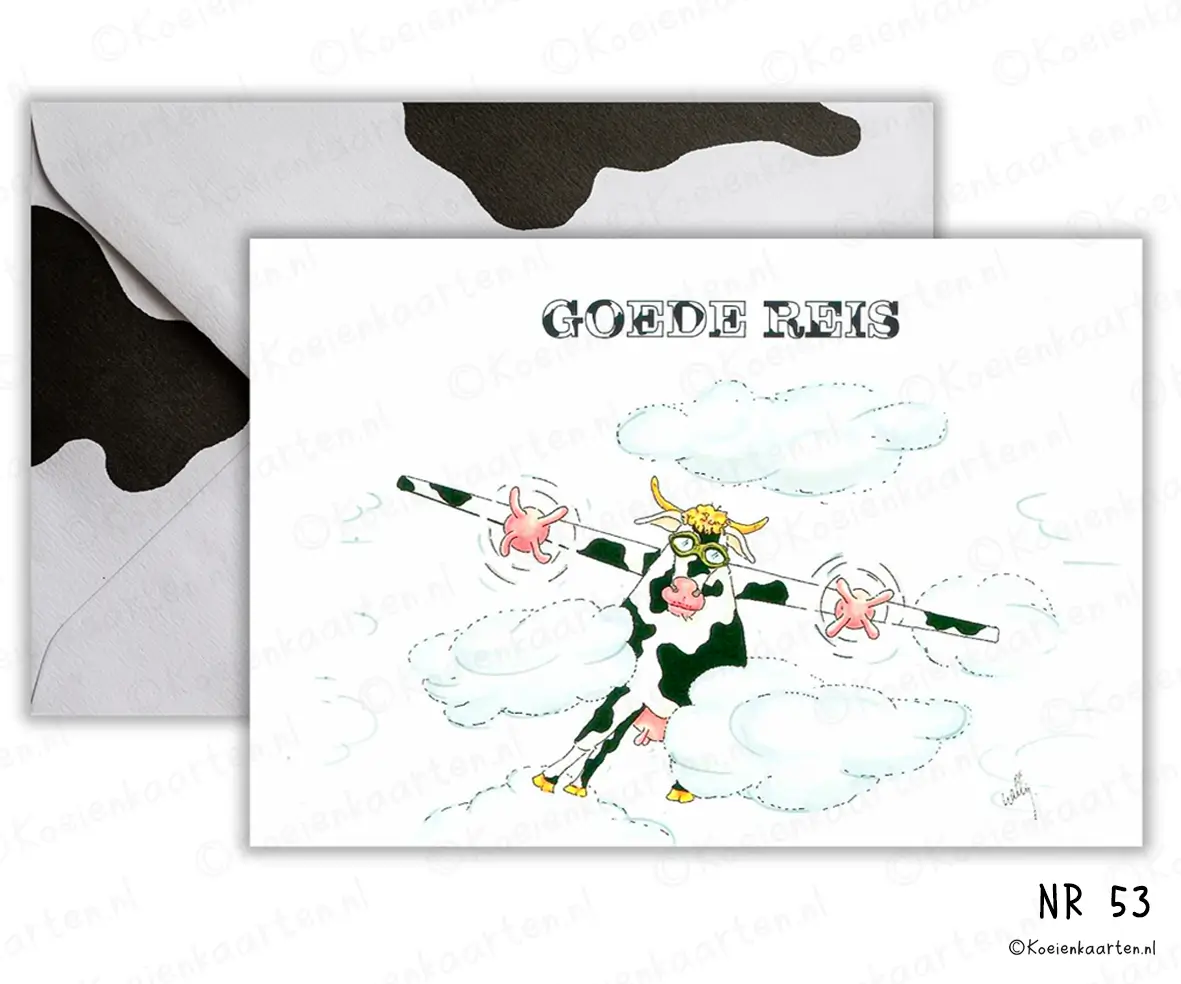 Leuke koeienkaart, goede reis Nr 52 met grappige cartoon! Afgebeeld zie je een koe vliegtuig in de wolken.