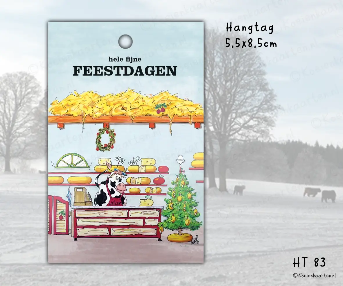 Leuke hangtag, speciaal voor de feestdagen rondom kerst en oud en nieuw Nr 83 met grappige cartoon koe.