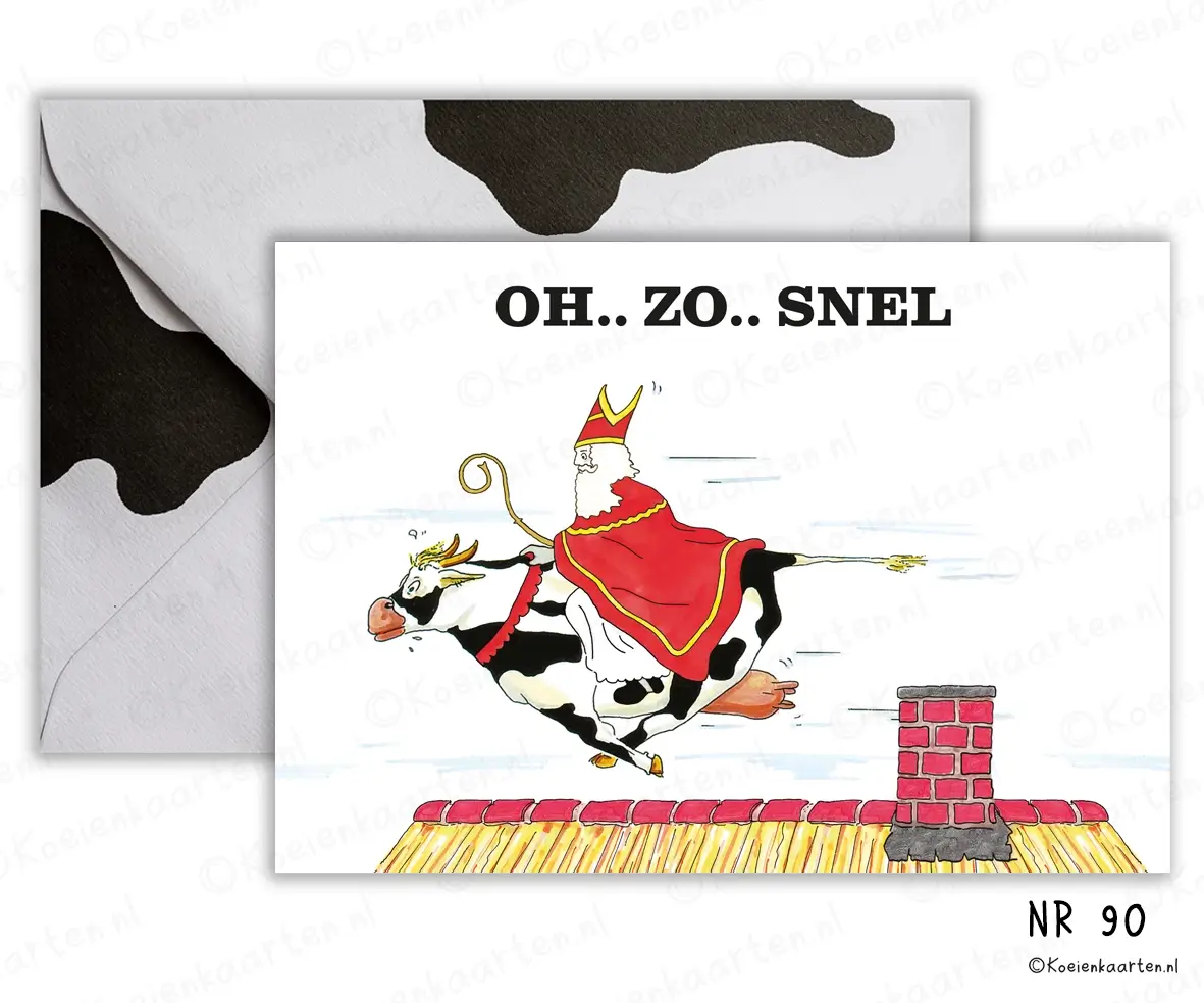 Leuke koeienkaart, Oh zo snel Nr 90 met cartoon koe. Afgebeeld met een over de daken sprintende koe met sinterklaas erop.