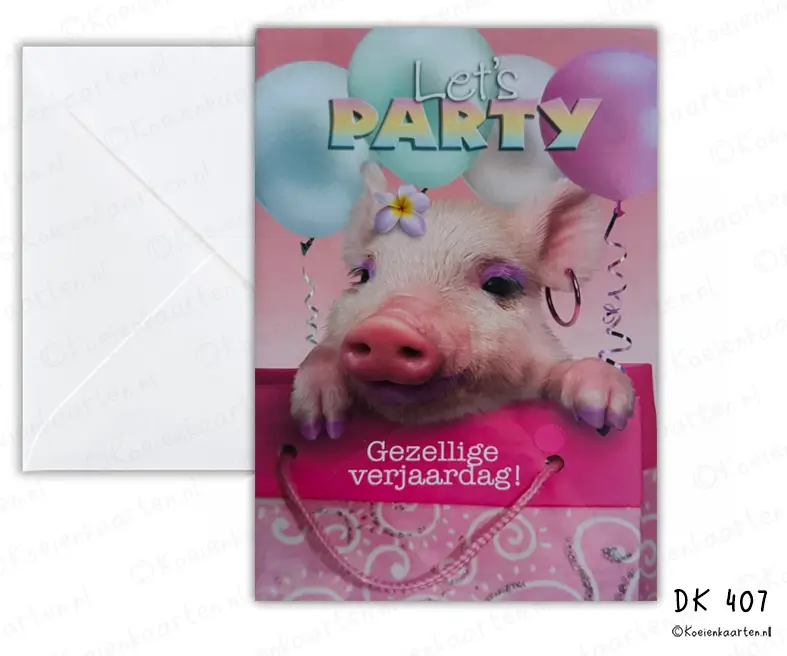 Mooie fotokaart, varkentje lets party DK 407 foto wenskaart met een afbeelding van een varkentje in kado verpakking en de tekst lets party.